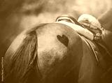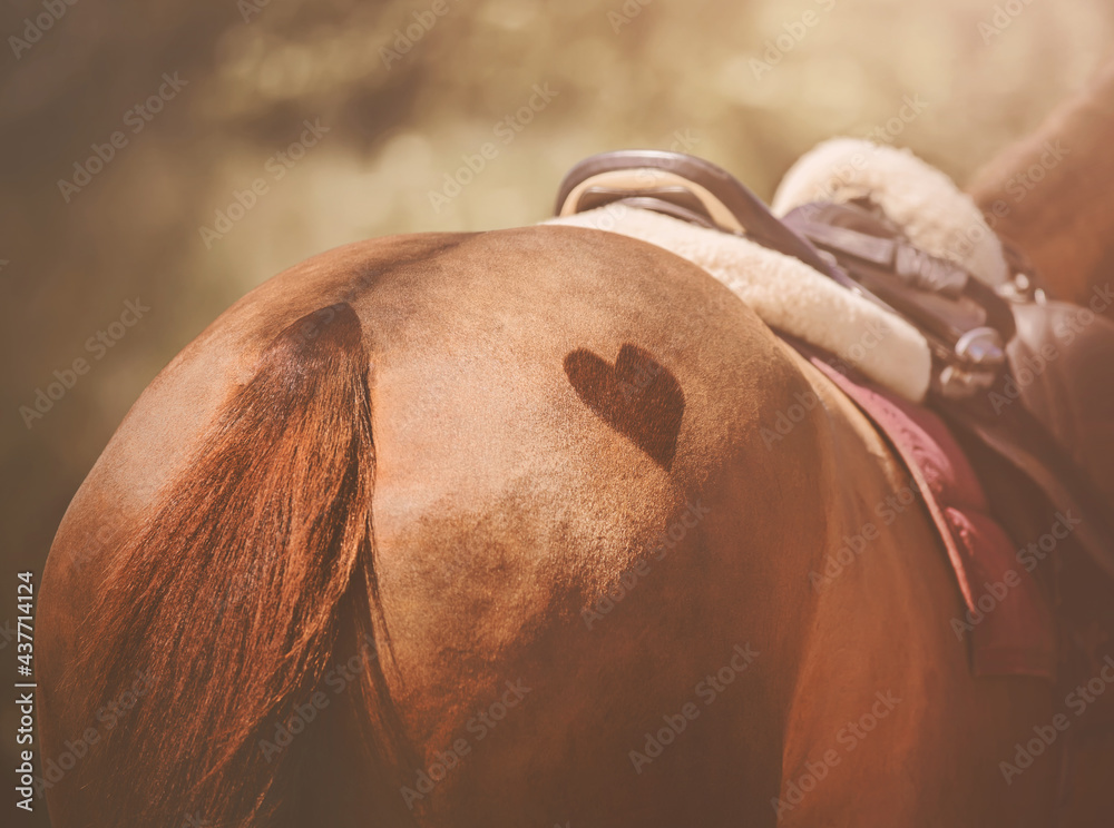 Rear view of the rump of a sorrel horse with a heart symbol shaved on it. And on the back of the horse is a leather saddle and a pink saddlecloth, illuminated by sunlight. Romance. Equestrian life.