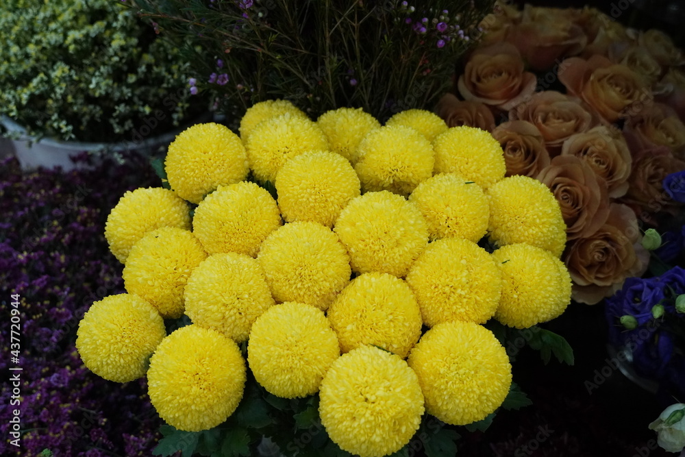 Bouquet of Flowers craspedia. Bright yellow balls in a florist shop. BFH