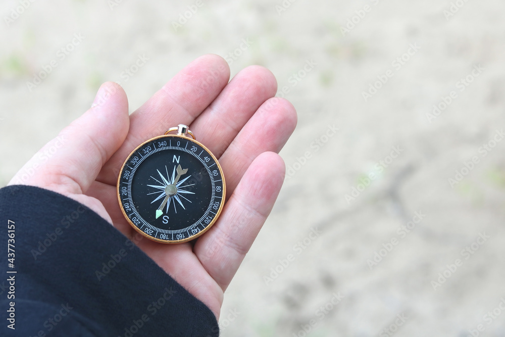 Old classic navigation compass in hand on natural background as symbol of tourism with compass, travel with compass and outdoor activities with compass