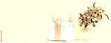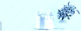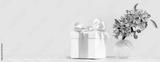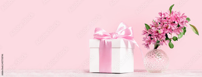 Pink pastel holiday banner with gift box and spring or summer flowers branch in a vase. Monochrome., birthday or wedding Mothers day