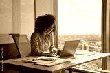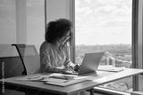 Happy smiling African American businesswoman executive manager sitting at desk working typing on laptop computer in contemporary corporation office with panoramic view. Business technologies concept.