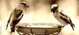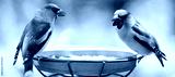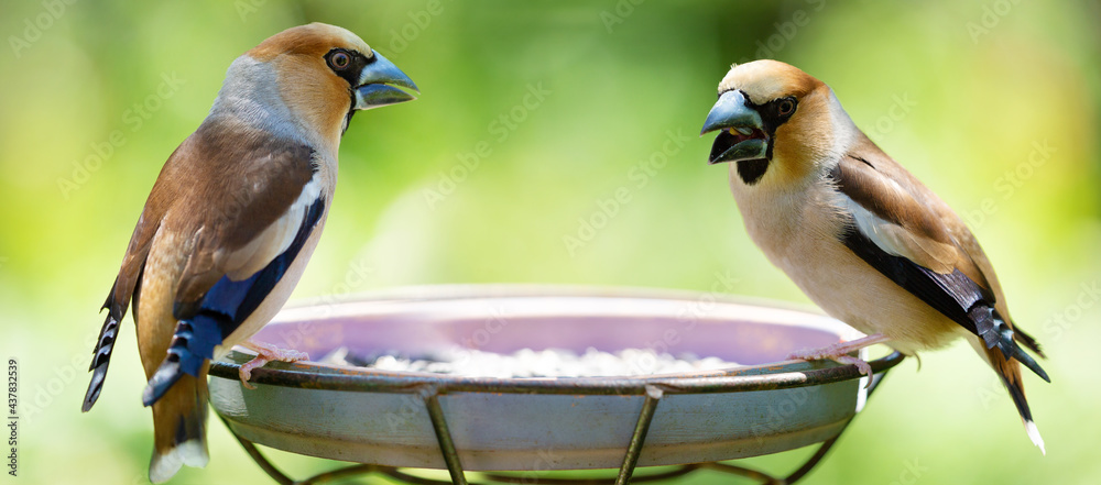Two little songbirds sitting on a bird feeder. Hawfinch ( Coccothraustes coccothraustes )