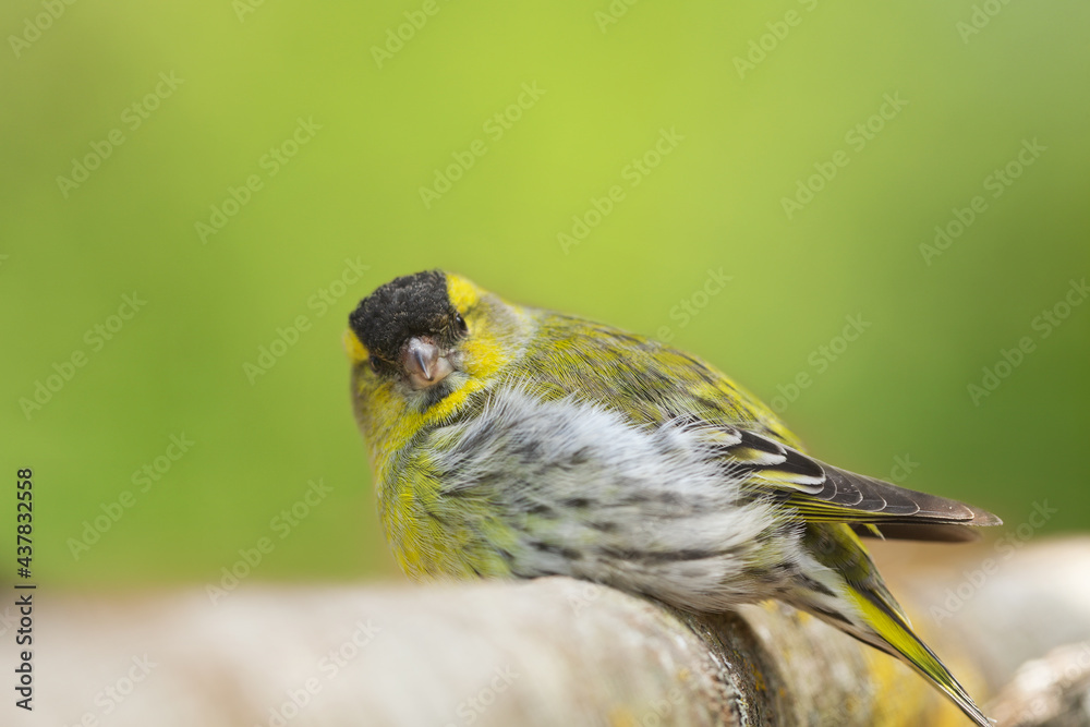 Little bird sitting on a branch over blurred green background. Eurasian Siskin (Spinus spinus)