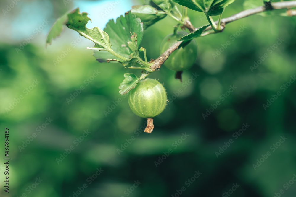 Close up of gooseberries on a gooseberry bush, on a farm.