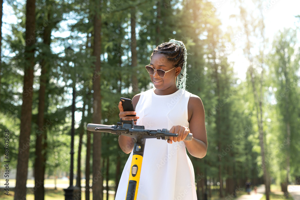 Beautiful young African woman through a mobile application takes a lease of electric pump
