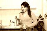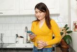 Beautiful young woman at home in the kitchen with a glass of water and a mobile phone