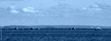 Panorama of Baltic sea shelf with boulders and stones. Clouds, yacht and birds in evening warm light. Clean nordic nature in gulf of Finland.