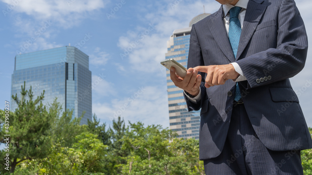 オフィス街でスマートフォンを操作するビジネスマン。