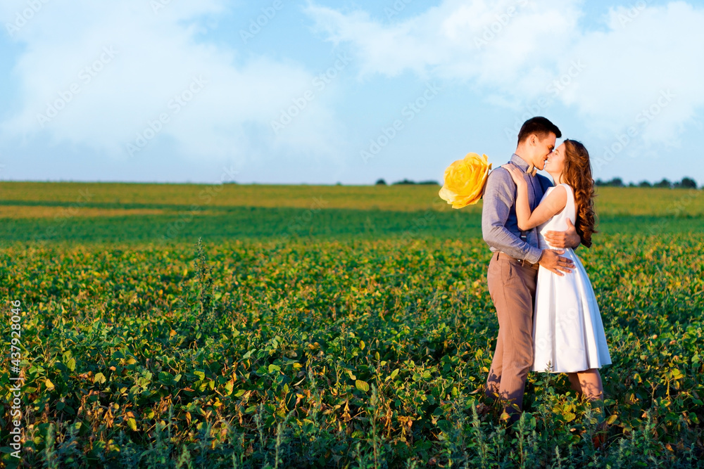 Young romantic wedding couple are posing on grass field. Happy loveling woman and man are walking together at beautiful nature on summer day. Love story concept. Template for invitation, greeting card