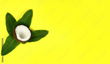 Summer bright banner, coconut and tropical leaves on yellow background. Copy space for text