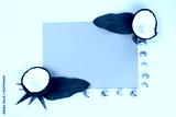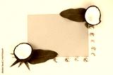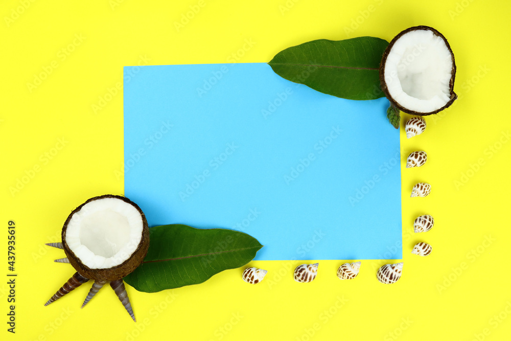 Summer bright mocap, coconut and tropical leaves, vacation concept. Copy space for text
