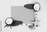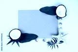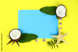 Summer bright mocap, coconut and tropical leaves, vacation concept