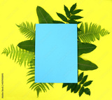 Summer mockup composition, coconut and tropical leaves on a yellow background