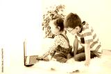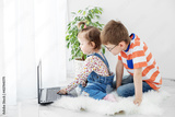 Small children are studying a laptop. Preschool age. Family, childhood, internet and games concept.