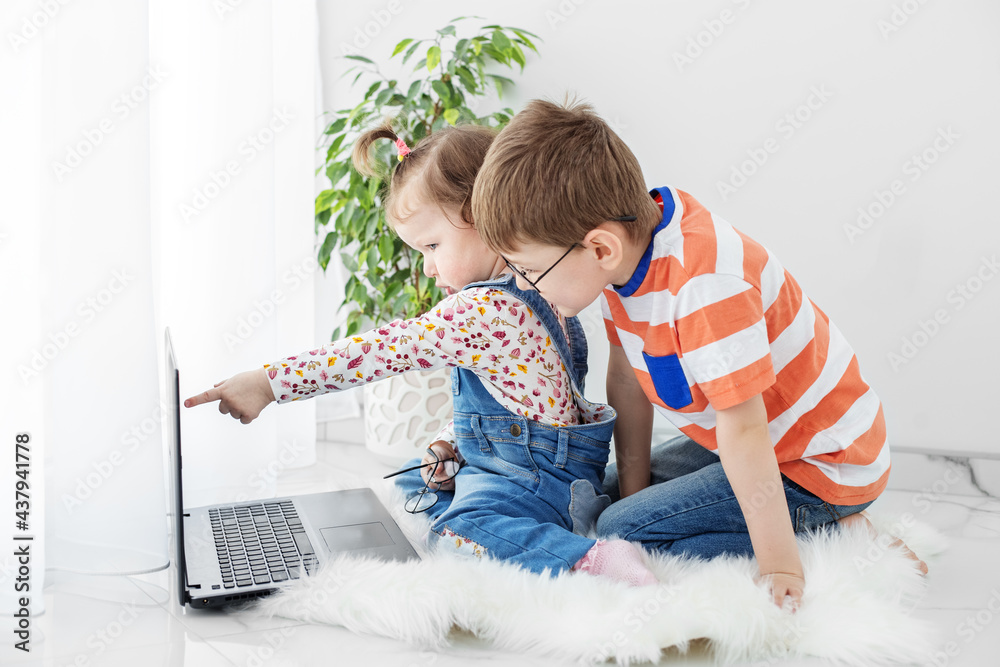 Brother and little sister are watching videos online. Preschool age. Family, childhood, internet and games concept.