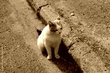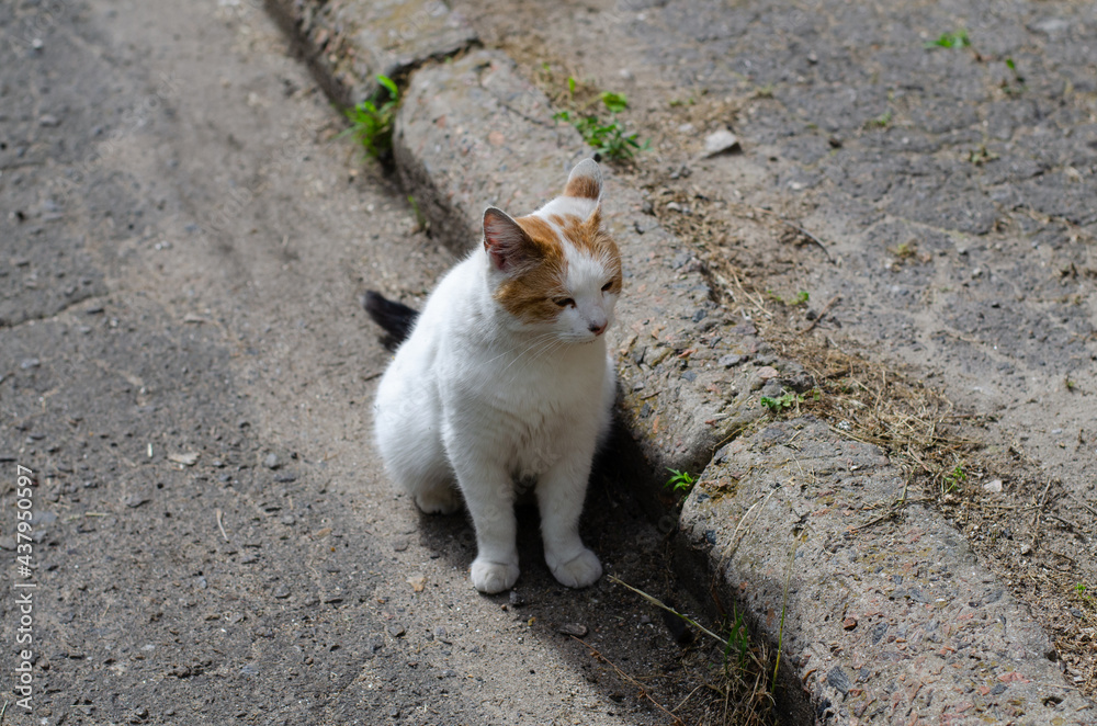 The spotted cat is sitting on the street. The street cat is walking. Abandoned pet.