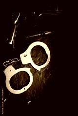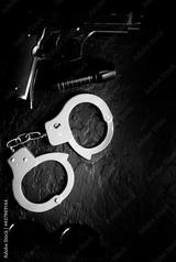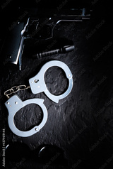 Black gun, flashlight, glasses and Police metal real handcuffs lie on the black background. Private detective work. Searching information. Crime and robbery, prison concept.