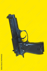 Barrel of a black gun, pistol lies on a yellow background. Close up.