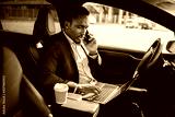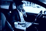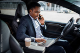 Serious businessman in formal suit talking on mobile and typing on laptop while sitting in luxury electric car. African man solving working moments on distance.