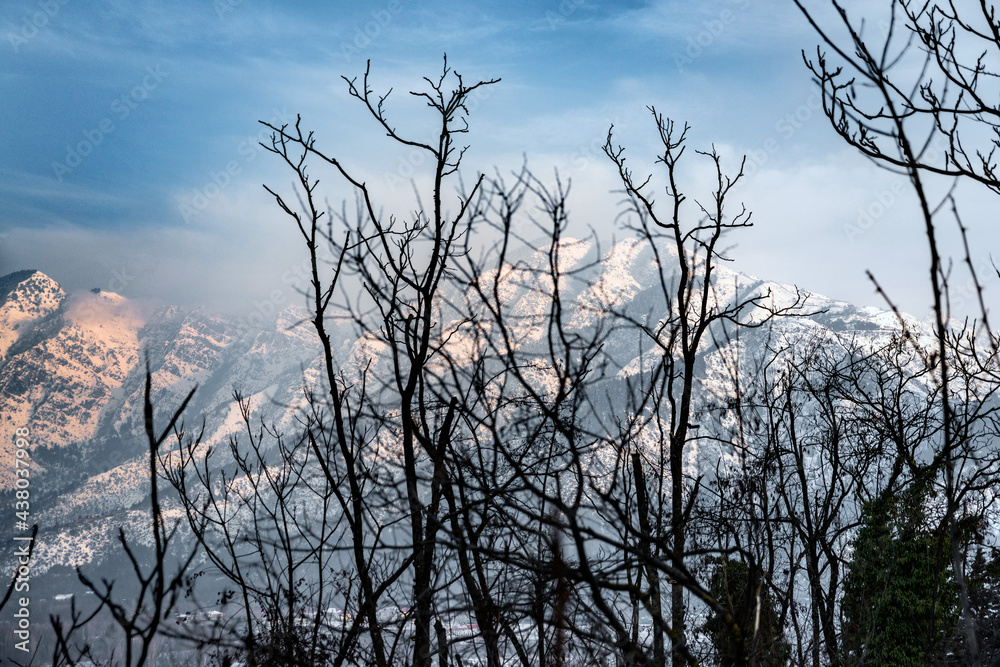 View of the mountain behind Dal Lake which is covered with fresh snowfall, Srinagar, Kashmir, India