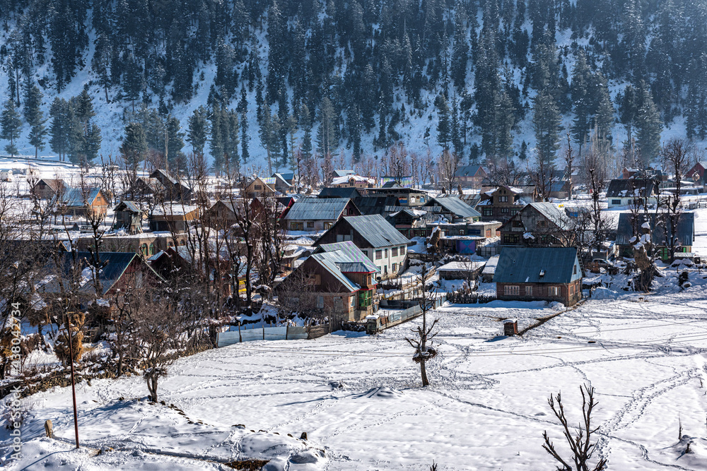 Snow-filled farm villages and rivers on the way from Srinagar to Sonmarg and Gulmarg