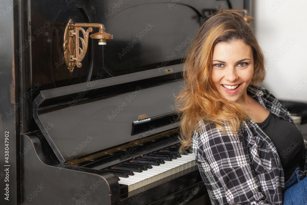 Portrait of attractive young woman posing at the piano. Horizontally.