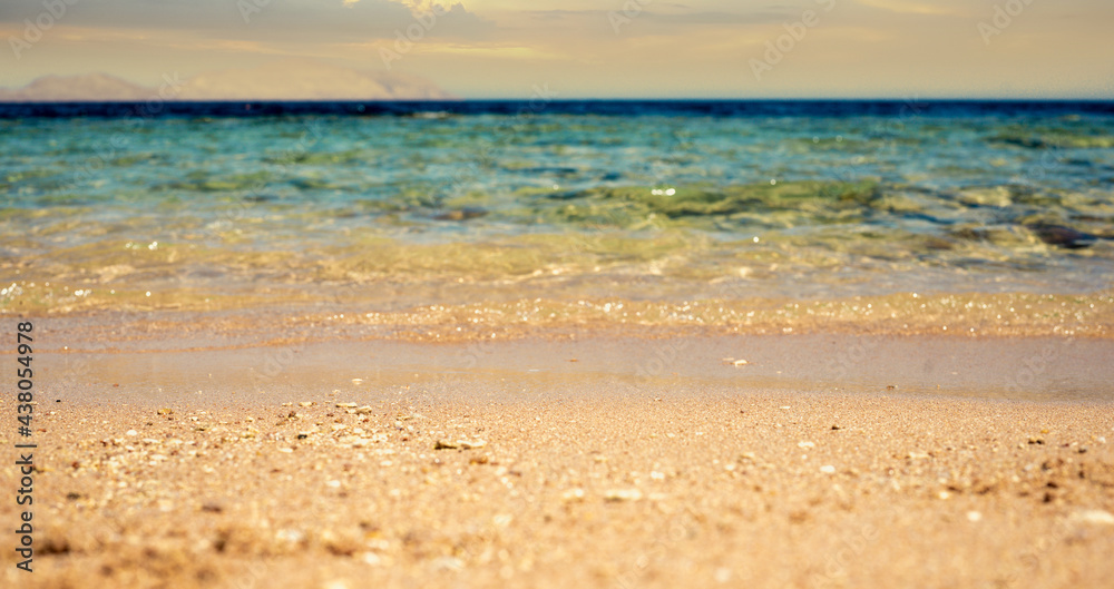 Tropical island vacation paradise. Beautiful blue wave with sea foam on sandy beach. Reflection of Sun Rays on the Water. Tranquil, Relaxing Travel Vacation. copy space