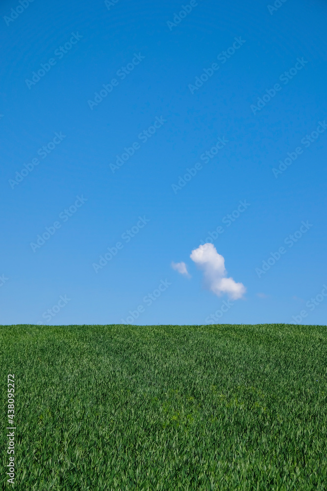 Green wheat field on sky background. A lone cloud in the sky. Copy space. Vertical image.