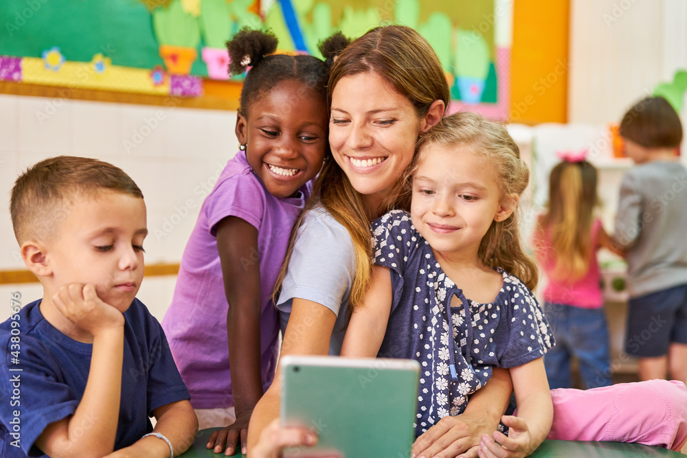 Tagesmutter und Kinder machen ein Selfie im Hort