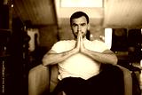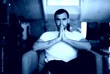 Portrait of handsome young brunette man in white t-shirt sitting in armchair at home