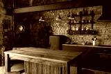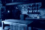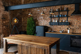 Side view of spacious industrial loft kitchen and living room with vintage decor and black cabinets