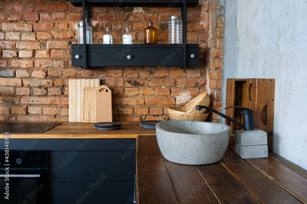 Side view on an open space industrial loft kitchen with vintage decor, black cabinets and concrete basin sink