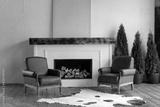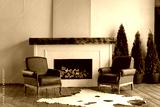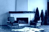 Spacious light white country house interior in eco style with teo chairs and fireplace