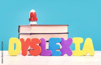 Dyslexia word multicolored letters on wooden desk with blue background, reading difficulty awareness and disorder concept. Pile of books. Rocket for achievement. Education and neurology copy space