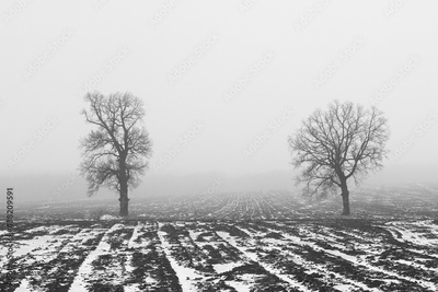 Black and white photo in retro style depicting a black oak trees on white snow among other black and white nature