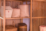 Women's Boxes, baskets, containers made of wooden natural materials, Set in a stylish wardrobe, Fashionable and elegant interior furnishings