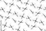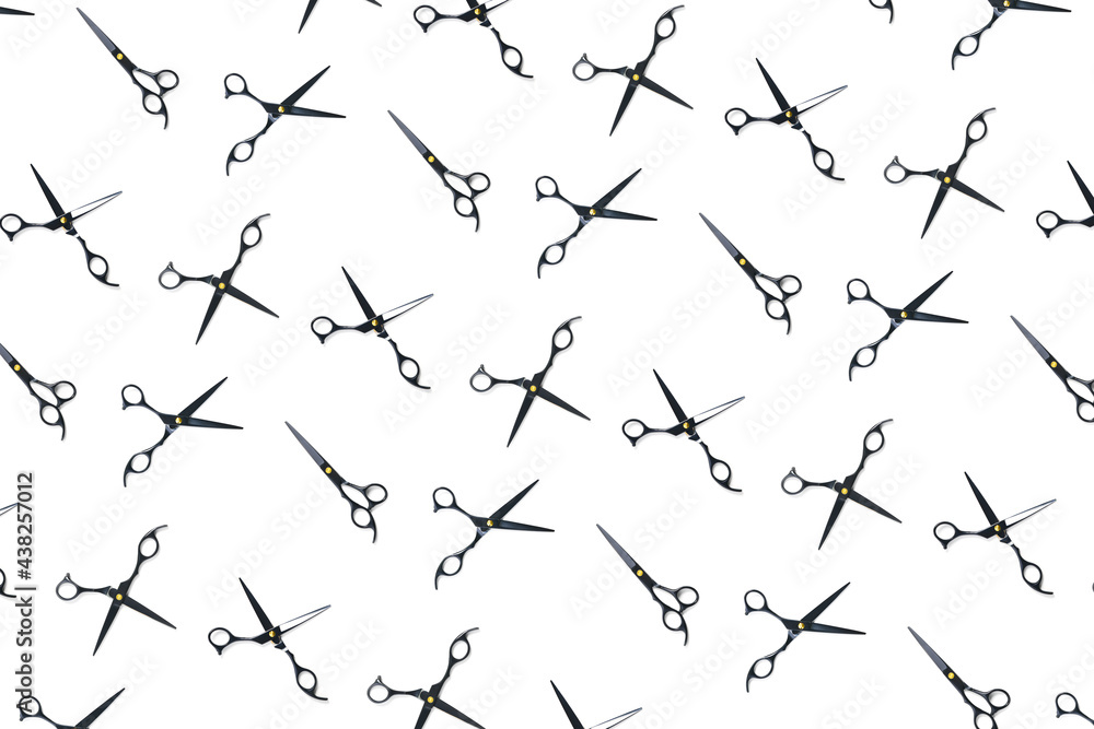 Background of black scissors. professional hairdresser black scissors isolated on white. Black barber scissors, close up. pop art background, for prints or posters. not seamless pattern