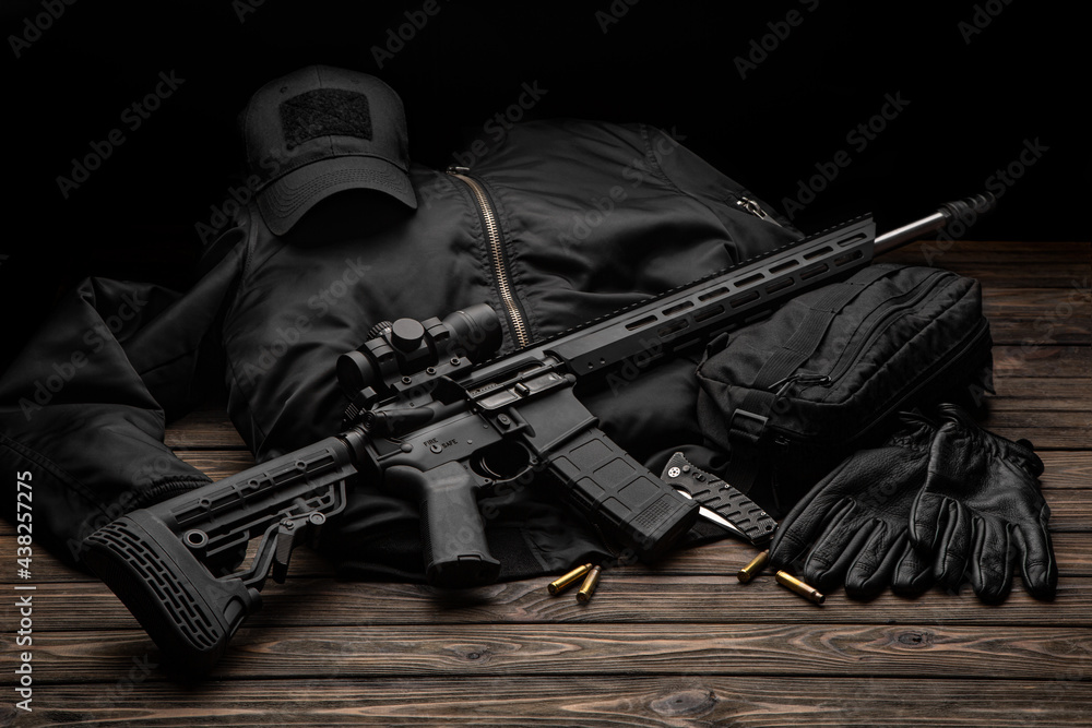 Modern automatic rifle with a telescopic sight on a dark background. Jacket, cap, gloves on a wooden table. The uniform of a guard or a mercenary