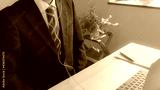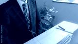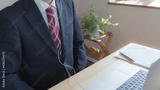 オンラインで面接を受けるスーツ姿の男性。イヤホンをつけてビデオ会議に参加する男性。