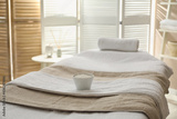 Massage table with soft towels and sea salt in spa salon