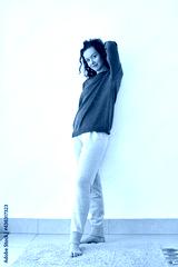 Full body of young barefoot female standing with hand behind head and smiling at camera