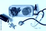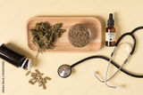 Cannabis oil extract, hemp seeds, dried leaf and hemp capsules on yellow background top view. Medical marijuana cbd oil.