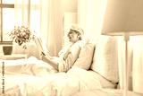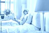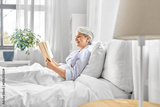 technology, old age and people concept - senior woman reading book in bed at home bedroom