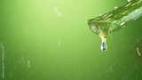 Aloe Vera leaf leaf with dripping beneficial liquid., isolated on gradient green background. Close-up.