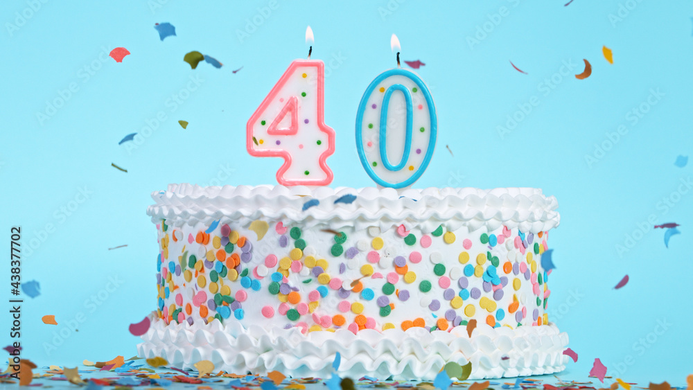 Colorful tasty birthday cake with candles shaped like the number 40. Pastel blue background.