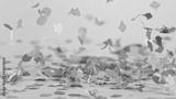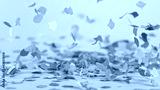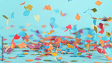 Color confetti falling on pastel blue background, macro shot.