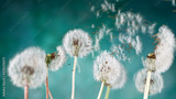 Macro Shot of Dandelion Seeds Being Blown isolated on Blue Background