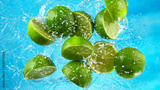 Fresh limes falling into water with splash on blue background