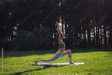 A young girl is doing yoga in the forest, outdoors on a sunny summer day. A girl stands in a rack, performs an asana in the park. Healthy lifestyle, meditation concept. Women's beauty and health