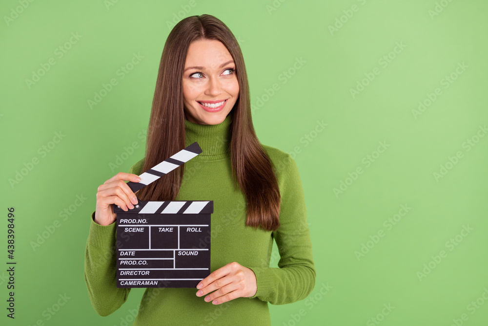 Photo portrait young girl smiling looking copyspace keeping clapboard isolated pastel green color background